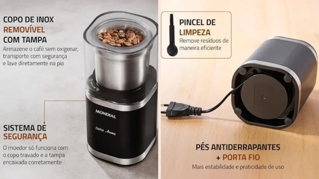 Uma das grandes vantagens do moedor de café elétrico Mondial é a tampa com sistema de segurança. Esse sistema não deixa o aparelho funcionar se a tampa não estiver corretamente colocada ajuda a evitar acidentes e garante a segurança durante o uso.